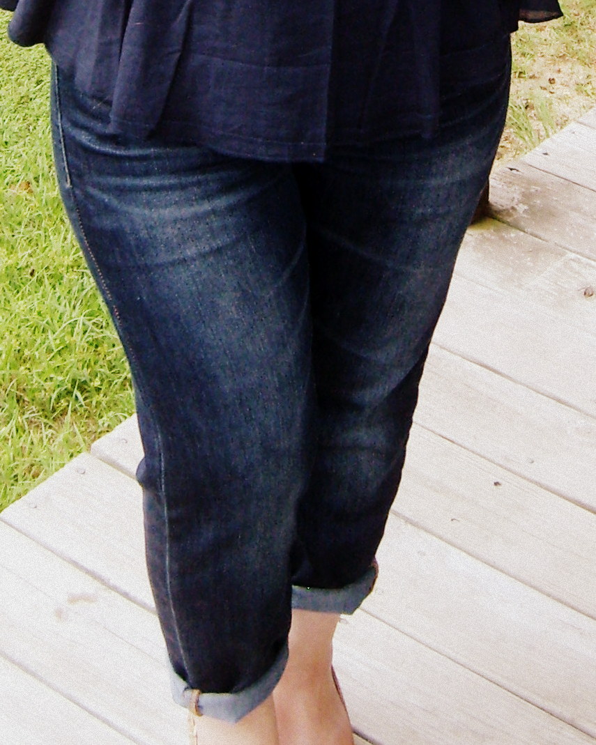 These 1969 sexy boyfriend jeans from Gap.com easily fit the curve of my hips and the slim, tapered leg pairs perfectly with this peplum blouse. The dark washed denim in city blue creates a longer look by avoiding a horizontal line that a lighter wash would give. I’m wearing size 29 petite. Unrolled this jean hits right on the tops of my feet.
